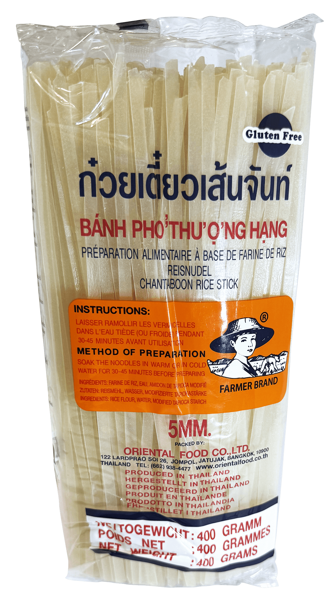Paket tradicionalnih tajskih riževih rezancev znamke Farmer Brand, narejenih iz riževe moke in tapiokinega škroba. Primerni so za pho juhe, wok jedi in so brez glutena.