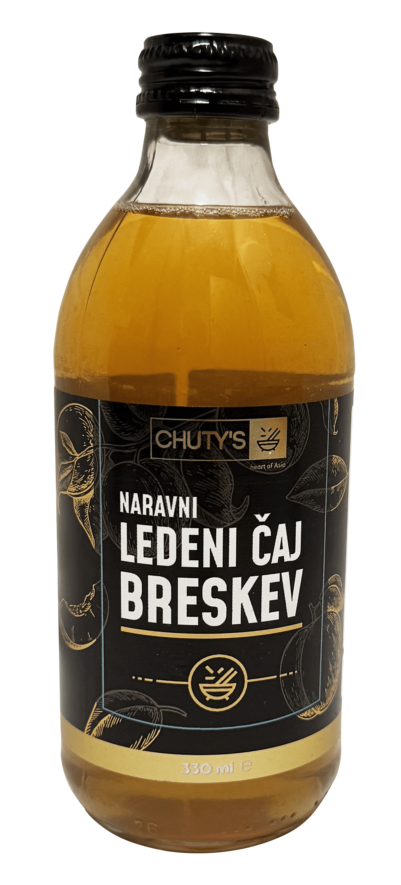 Steklenička naravnega breskovega ledenega čaja znamke CHUTY’S. Embalaža je črna z ilustracijami breskev in zlato obrobo, napitek pa je svetlo jantarne barve.