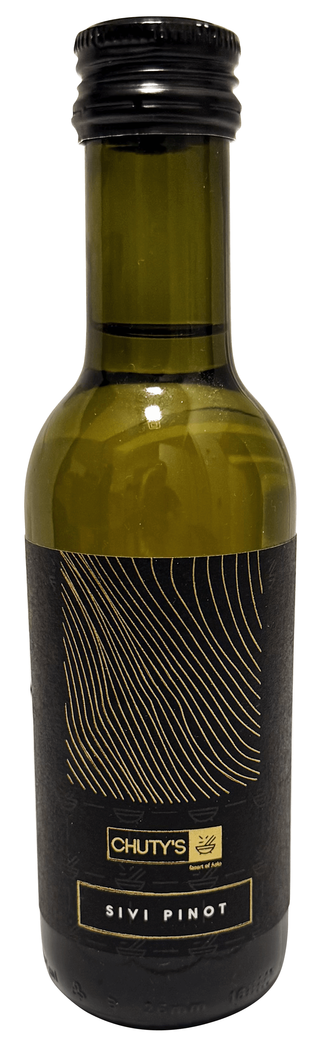 Majhna steklenička vina Sivi Pinot znamke CHUTY’S, z moderno črno-zlato etiketo. Gre za elegantno porcijsko pakiranje za restavracije ali degustacije.